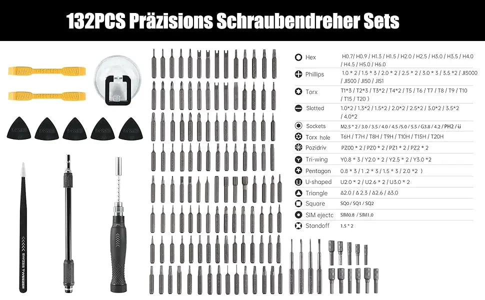 🎒 Organização Inteligente: Todos os itens vêm em uma maleta resistente, com compartimentos bem definidos e acessórios extras como ventosa, pinça, espátula e chave triangular.