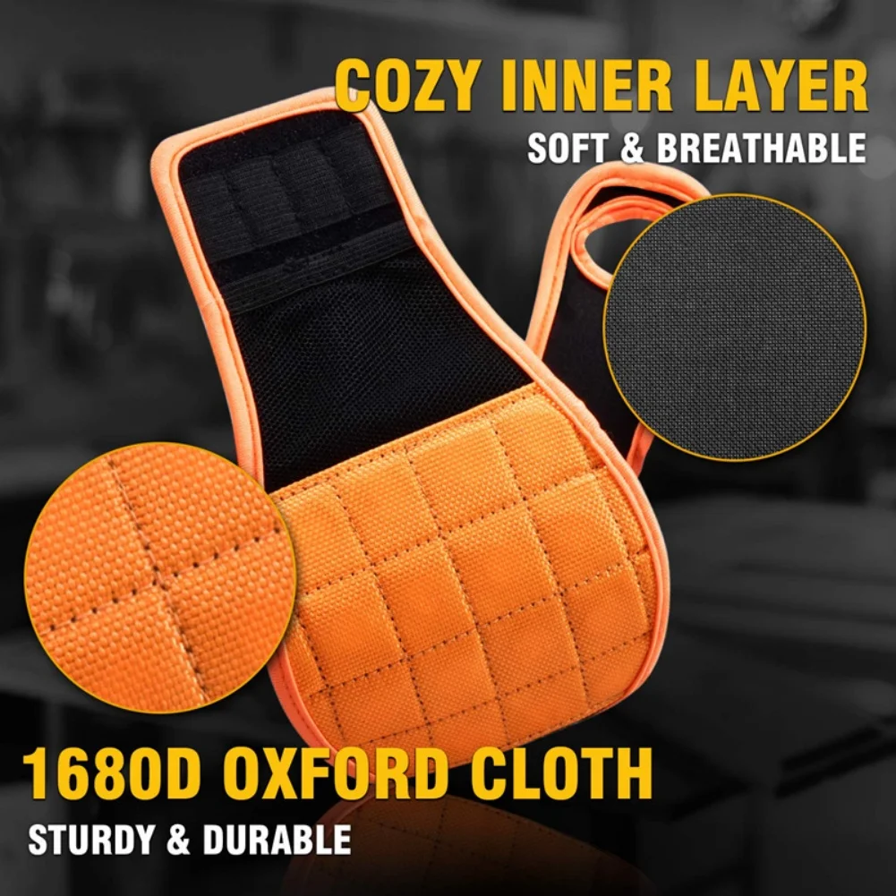 16 potentes imãs de neodímio embutidos + 4 bolsos elásticos e um compartimento em mesh com velcro — espaço para ferramentas não metálicas também